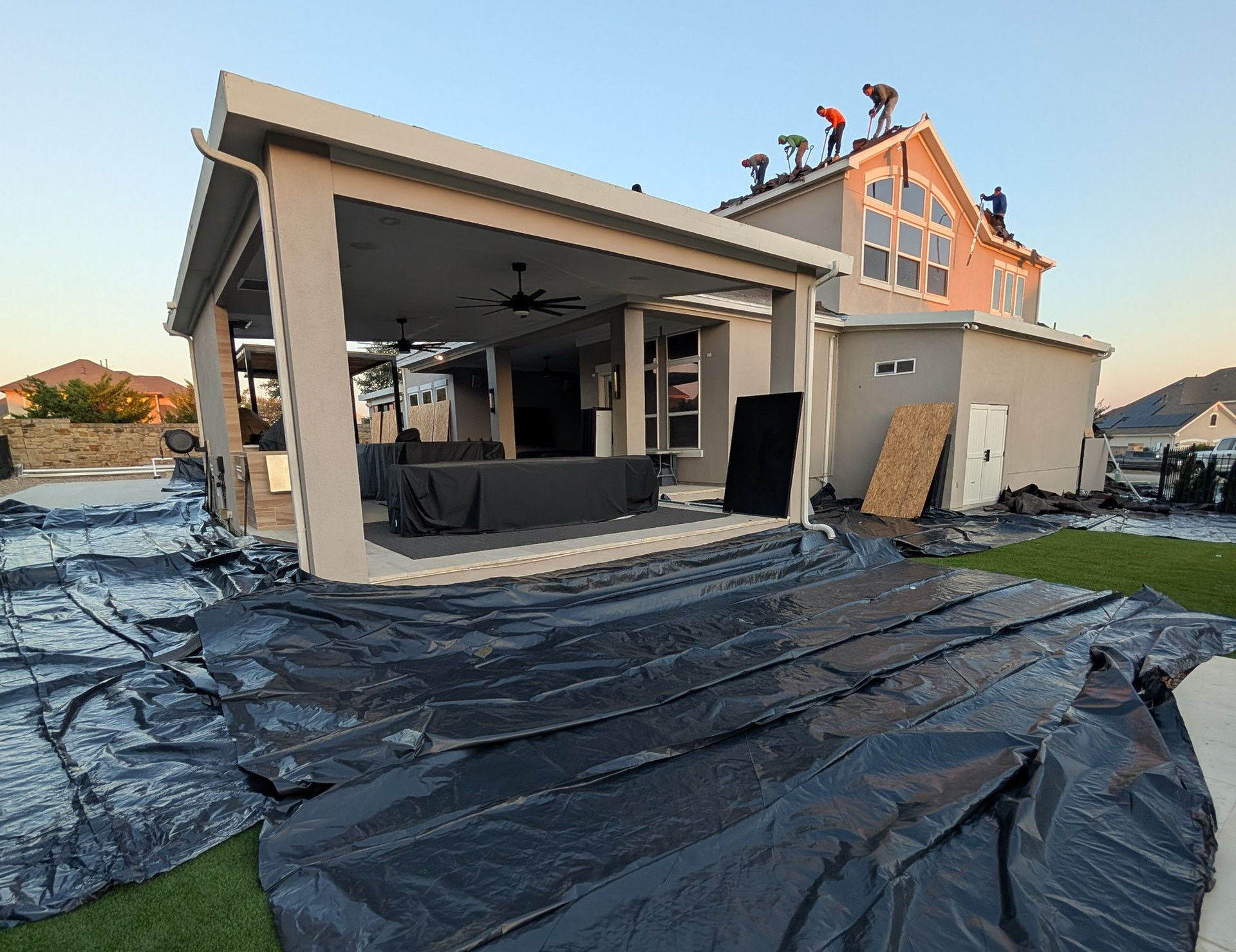 To begin the reroof on this home, the site was prepared with over 4,000 square feet of protective tarp to protect all landscaping and property. This home has 48 solar panels, which had to be removed and properly stored. Then teardown began: The existing roof, gutters, and downspouts were removed down to the decking, which was inspected and repaired as needed.